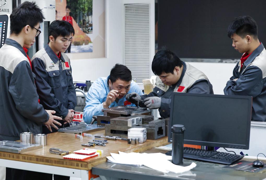2月25日,在廣東省機械技師學院,楊登輝(中)指導學生提升器件加工精度。
