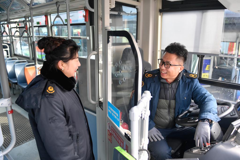 2月25日,在吉林市城市公共交通集團有限公司第四分公司,馬秀娟(左)與一名公交車駕駛員交談。