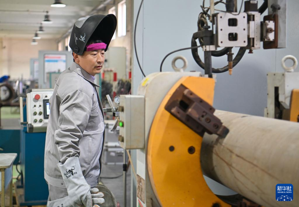 在中石化第四建設有限公司工匠學院,全國人大代表、中石化第四建設有限公司工匠學院焊接教練張振連操作自動焊機(2025年2月21日攝)。