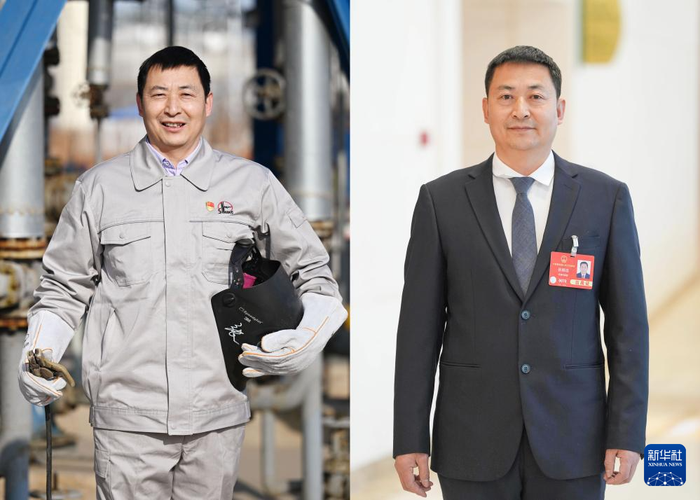 拼版照片:左圖為在中石化第四建設有限公司工匠學院拍攝的全國人大代表、中石化第四建設有限公司工匠學院焊接教練張振連(新華社記者李然2025年1月21日攝);右圖為在十四屆全國人大三次會議天津代表團駐地拍攝的張振連(新華社記者邢廣利2025年3月3日攝)。