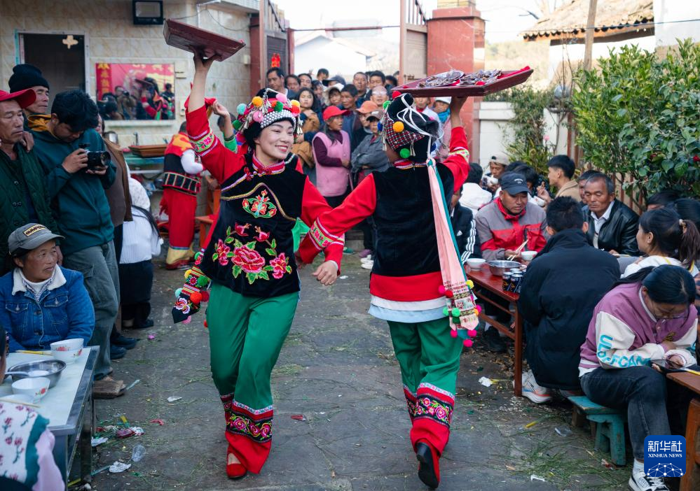 全國人大代表、云南省南澗彝族自治縣民族文化工作隊隊員魯麗華(前左)在南澗彝族自治縣寶華鎮擁政村表演跳菜(2025年2月7日攝)。