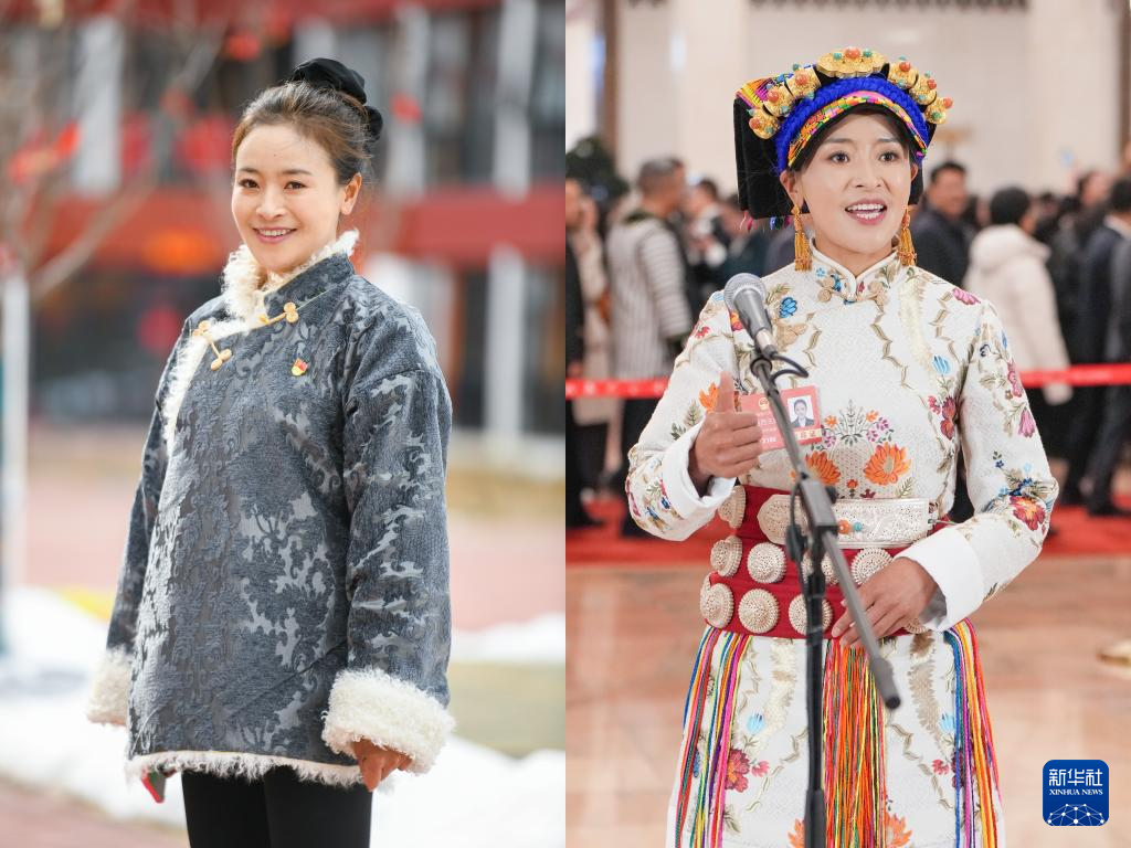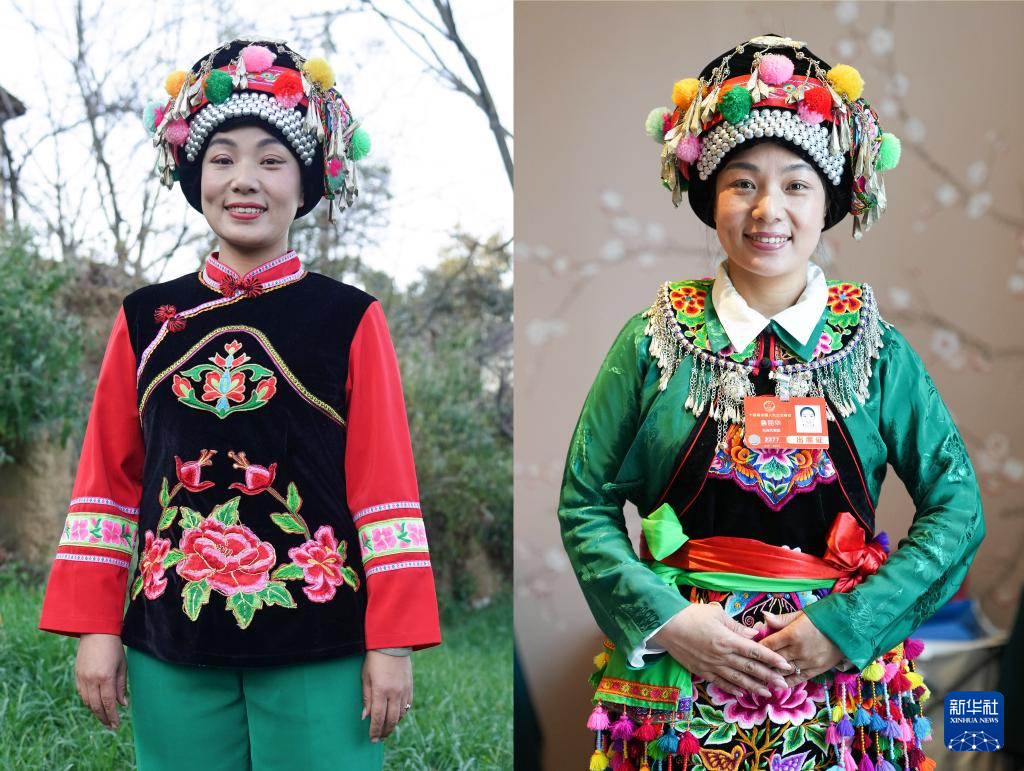 拼版照片:左圖為在云南省南澗彝族自治縣寶華鎮擁政村拍攝的全國人大代表、南澗彝族自治縣民族文化工作隊隊員魯麗華(新華社記者陳欣波2025年2月7日攝);右圖為在十四屆全國人大三次會議云南代表團駐地拍攝的魯麗華(新華社記者鄭煥松2025年3月6日攝)。