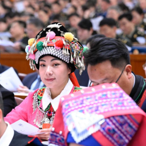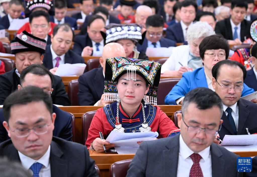 3月5日,全國人大代表、貴州省安順市鎮寧布依族苗族自治縣六馬鎮致富村黨支部書記、村委會主任盧丹(二排中)在北京人民大會堂出席十四屆全國人大三次會議開幕會。