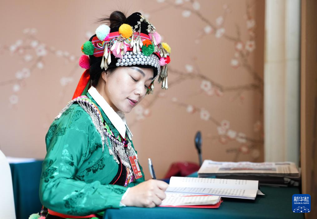3月6日,全國人大代表、云南省南澗彝族自治縣民族文化工作隊隊員魯麗華在北京的駐地做筆記。