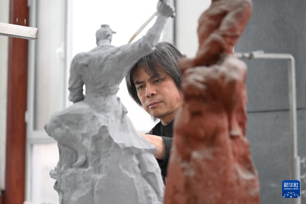 全國政協委員、河北翰鼎雕塑集團首席技師高英坡在河北省曲陽縣的工作室進行雕塑創作(2025年2月21日攝)。