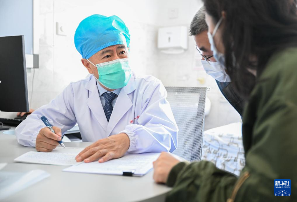在蘇州大學附屬第一醫院血液科,全國政協委員、蘇州大學附屬第一醫院血液科主任吳德沛和患者家屬交談(2025年2月18日攝)。