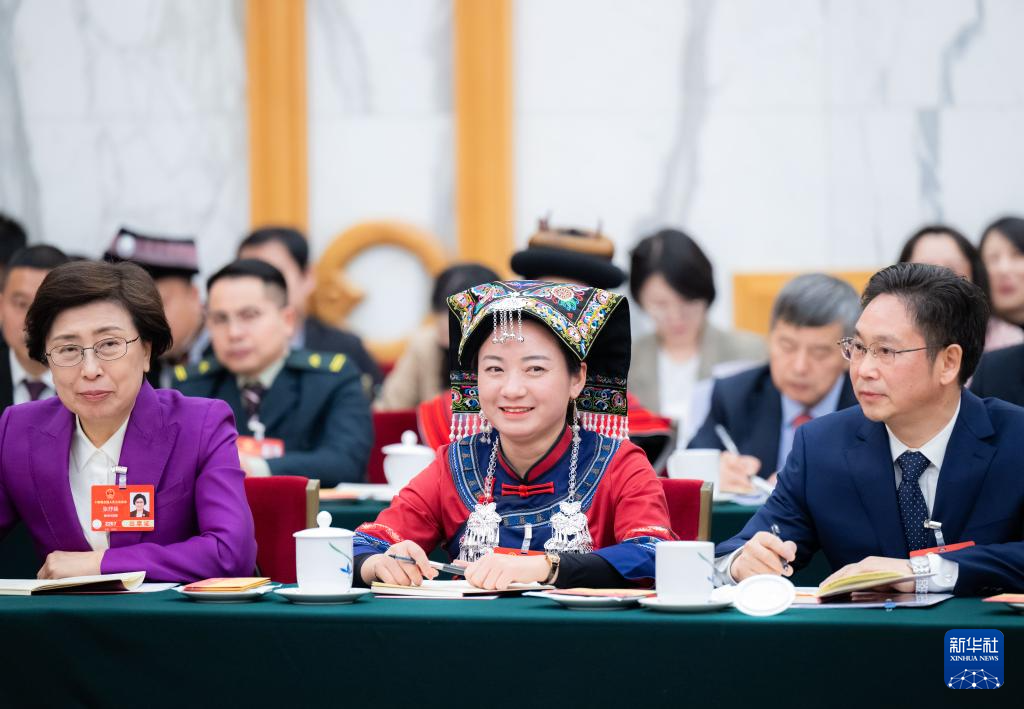 3月5日,全國人大代表、貴州省安順市鎮寧布依族苗族自治縣六馬鎮致富村黨支部書記、村委會主任盧丹(中)在北京出席十四屆全國人大三次會議貴州代表團全體會議。