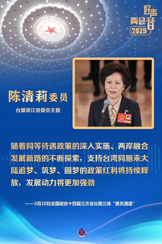 臺盟浙江省委會主委陳清莉委員分享了臺灣同胞在浙江生活、創業的故事。她表示,隨著同等待遇政策的深入實施、兩岸融合發展新路的不斷探索,支持臺灣同胞來大陸追夢、筑夢、圓夢的政策紅利將持續釋放,發展動力將更加強勁。