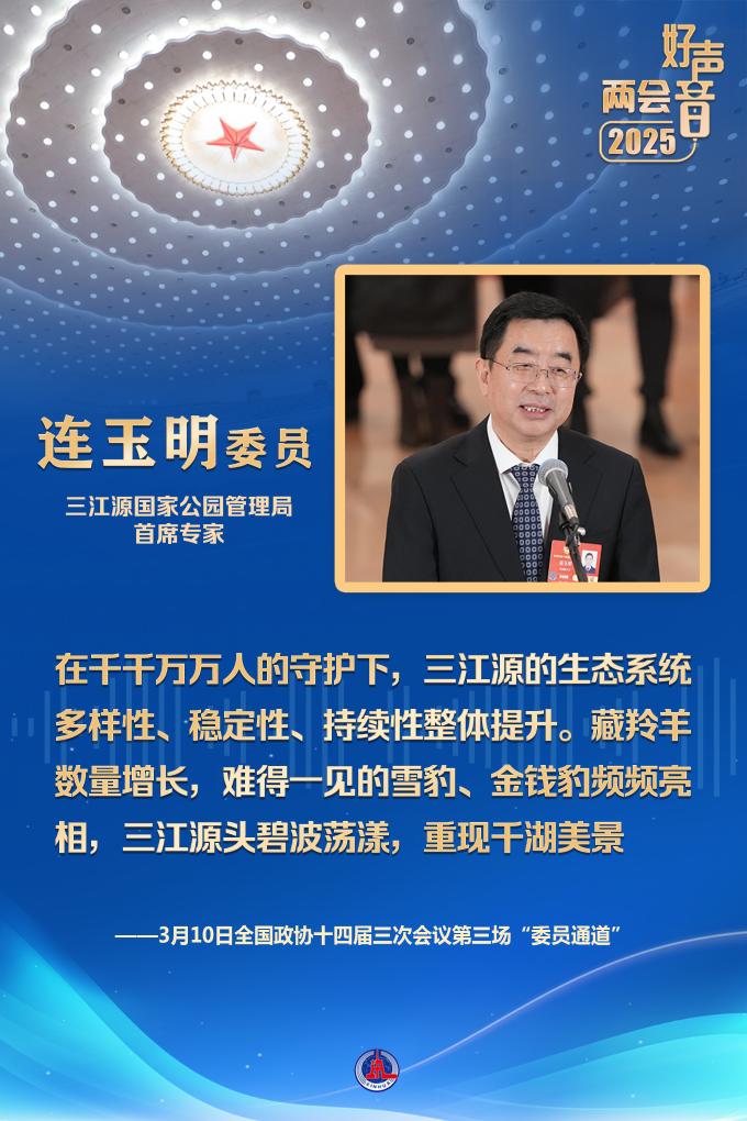 第一位回答記者提問的三江源國家公園管理局首席專家連玉明委員,是一名援青干部。他告訴大家,在三江源國家公園,有21432名生態管護員。在千千萬萬人的守護下,三江源的生態系統多樣性、穩定性、持續性整體提升。藏羚羊數量增長,難得一見的雪豹、金錢豹頻頻亮相,三江源頭碧波蕩漾,重現千湖美景。