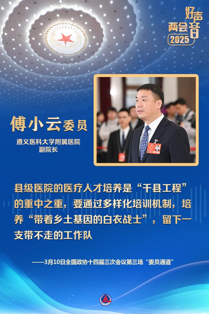 “國家持續實施‘千縣工程’,開展醫療人才‘組團式’支援幫扶,支援西藏、新疆、青海等地區醫院和國家鄉村振興重點幫扶縣人民醫院?!弊窳x醫科大學附屬醫院副院長傅小云委員說。