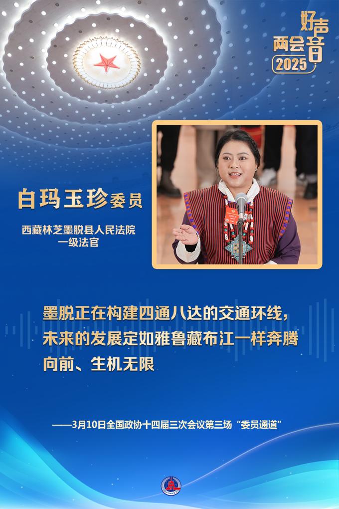 白瑪玉珍委員來自全國最后一個通公路的縣——西藏墨脫。她說,墨脫實現了從“高原孤島”向“美麗邊城”的時代蛻變,家家戶戶用上了干凈水、穩定電、高速網,老百姓吃上了“生態旅游飯”,增收的路子越來越寬。