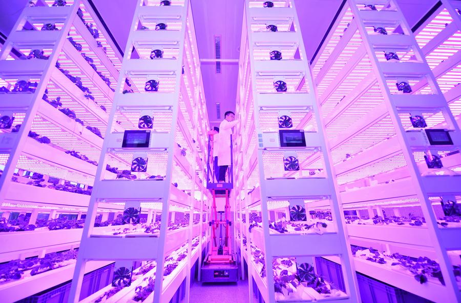 科技人員在中國農業科學院都市農業研究所智能植物工廠觀察農作物生長情況(2024年10月16日攝)。新華社記者 劉坤 攝