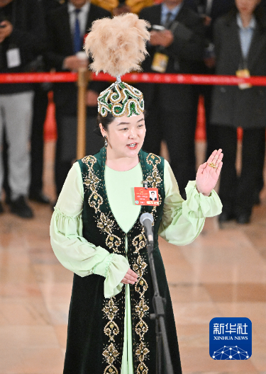 3月11日,第十四屆全國人民代表大會第三次會議第三場“代表通道”集中采訪活動在北京人民大會堂舉行。這是全國人大代表卓婭·巴合提接受媒體采訪。新華社記者 胥冰潔 攝