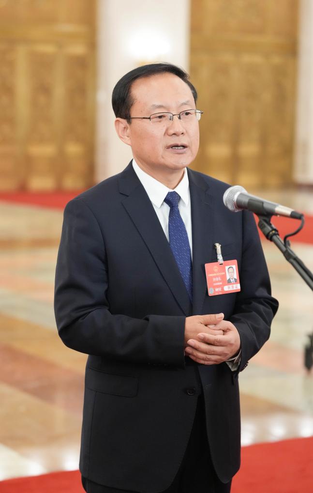 3月11日,第十四屆全國人民代表大會第三次會議第三場“部長通道”集中采訪活動在北京人民大會堂舉行。這是文化和旅游部部長孫業禮接受媒體采訪。新華社記者 鄭煥松 攝