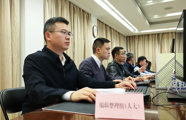 3月5日,國辦工作人員對材料進行審核匯編。新華社記者 盧燁 攝