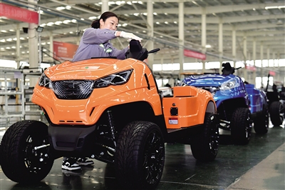 圖為在山東永利新能源車業有限公司,工作人員生產新能源高爾夫球車。 新華社記者 郭緒雷 攝