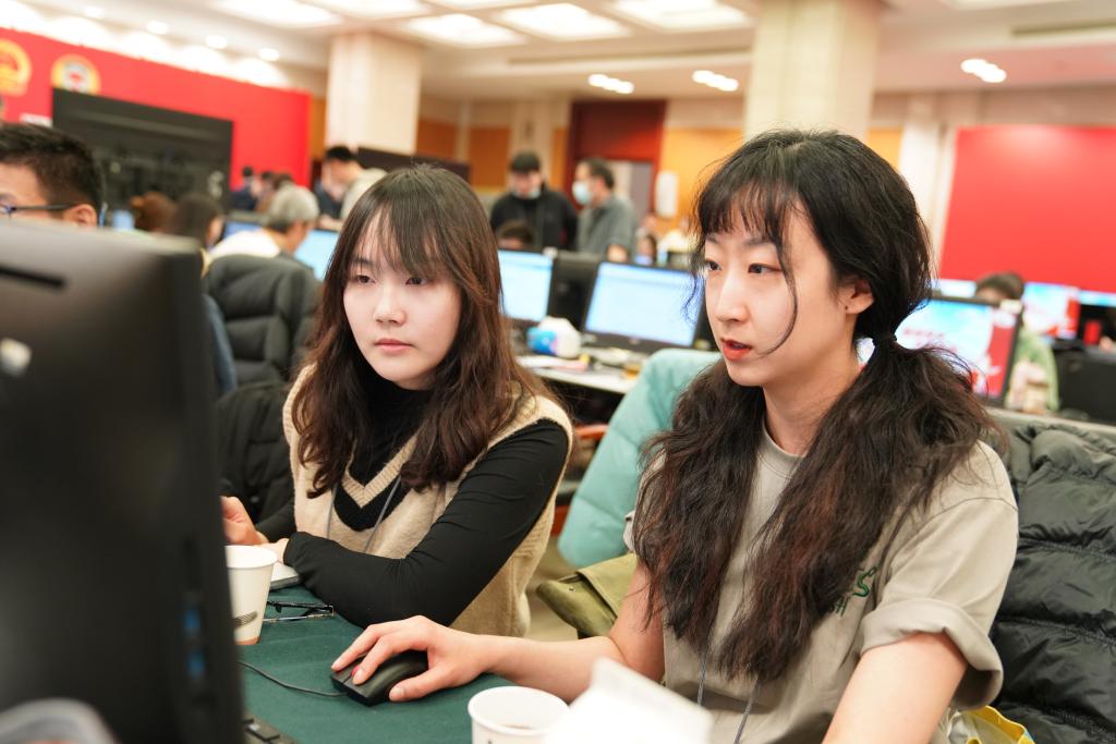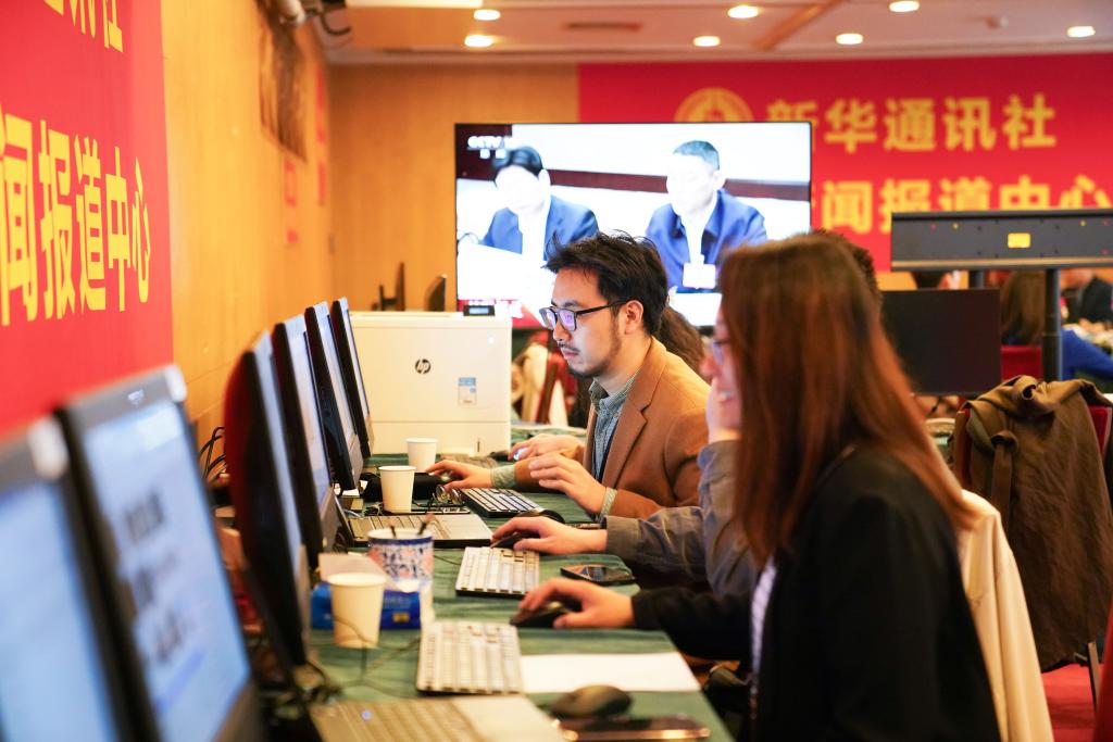 3月6日,我(前左)和同事劉夢琪在后方兩會新聞報道中心工作。新華社記者 陳朔 攝