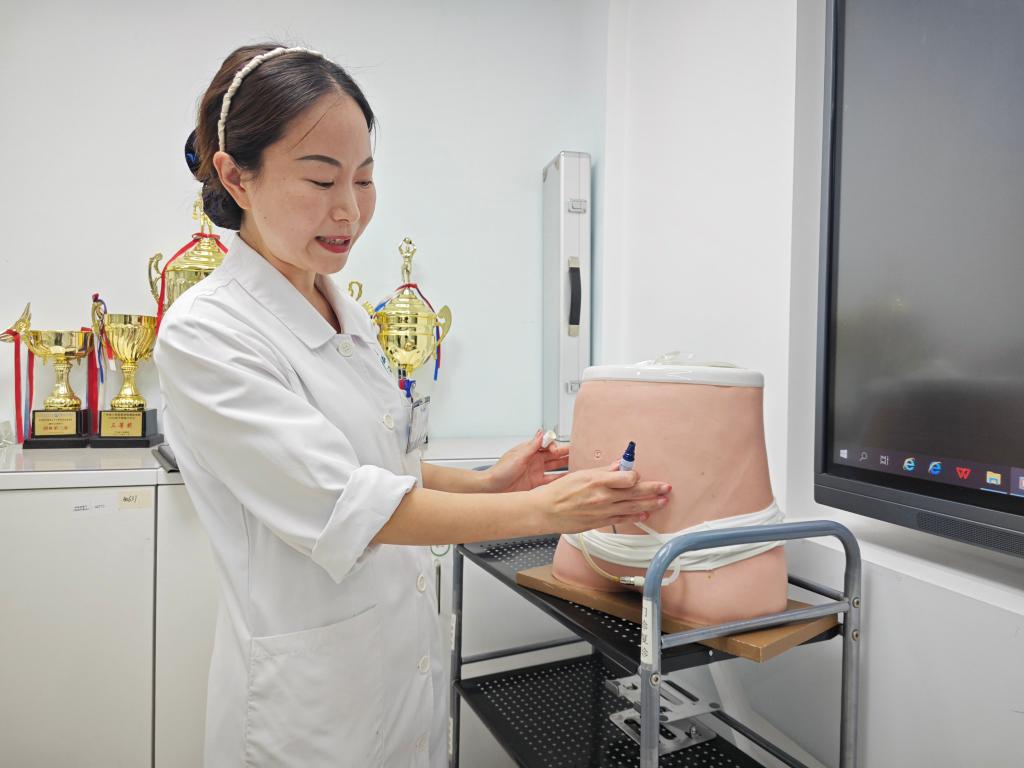 曾以林使用腹膜透析護理操作模型進行示教。新華社記者 徐弘毅 攝