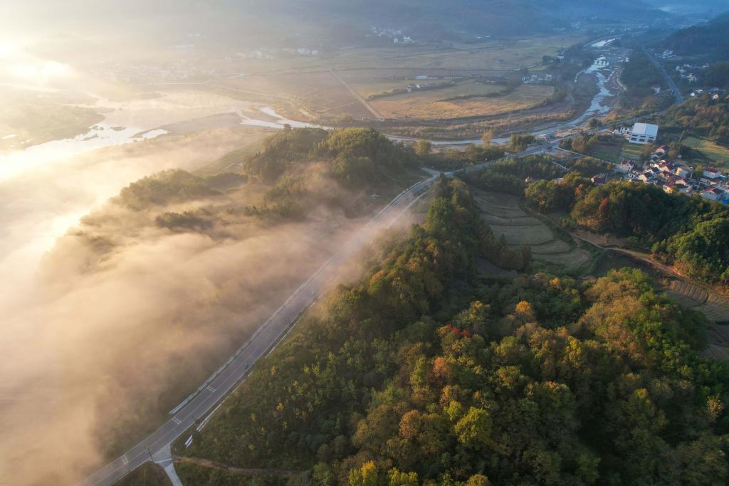 2024年11月8日,在安徽省宣城市旌德縣三溪鎮,“四好農村路”與錯落有致的民居、青山、晨霧等相映成景(無人機照片)。新華社記者 曹力 攝