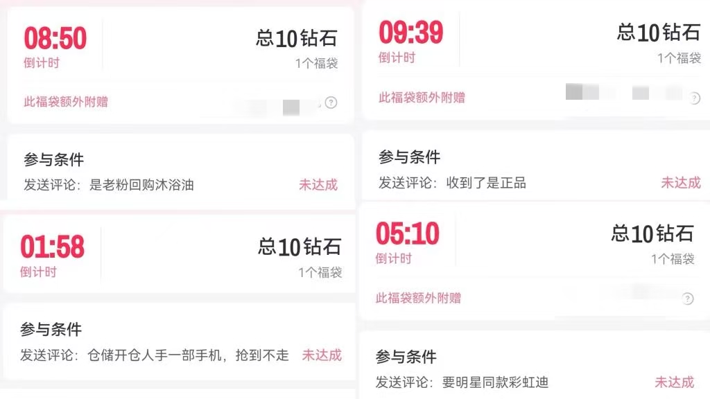 一些倉播直播間的“福袋”抽獎,必須發送指定評論才能參與。(拼版視頻截圖)