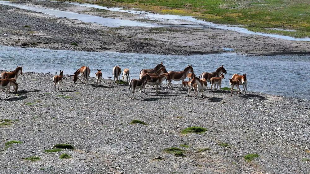 這是2024年8月9日在位于三江源國家公園長江源園區的曲麻萊縣境內拍攝的藏野驢(無人機照片)。新華社發(昂江 攝)