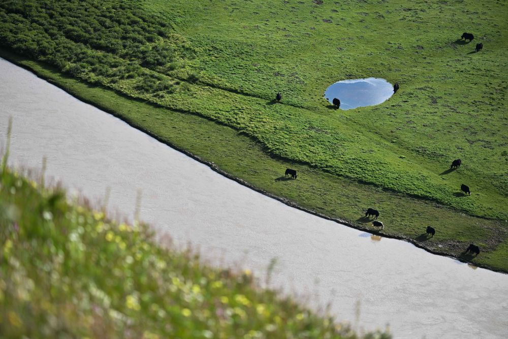 一群牦牛在青海省果洛藏族自治州達日縣境內的黃河岸邊覓食(2024年7月31日攝)。新華社記者 李占軼 攝