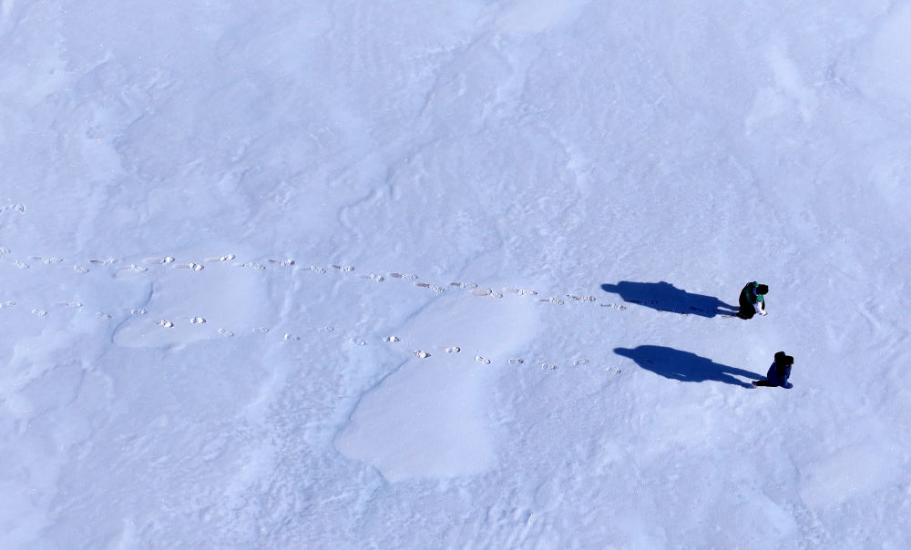 在青海省果洛藏族自治州瑪多縣黃河鄉境內,兩名生態管護員在開展生態巡護(2025年2月22日攝,無人機照片)。新華社記者 張宏祥 攝