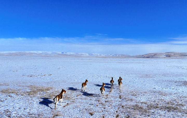 在青海省果洛藏族自治州瑪多縣黃河鄉境內,藏野驢在雪后活動(2025年2月22日攝,無人機照片)。新華社記者 張宏祥 攝