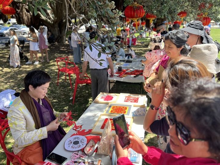 2024年2月4日,湖北鄂州雕花剪紙省級代表性傳承人曹小琴在新西蘭向當地民眾展示剪紙技藝。新華社發