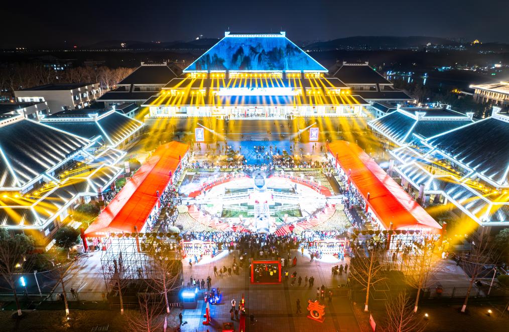 2月12日拍攝的湖北省博物館“鐘鳴楚天元宵夜”燈會活動(無人機照片)。新華社記者 肖藝九 攝