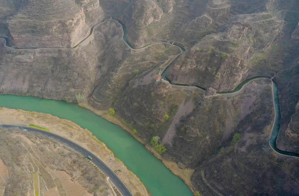 在河南省林州市紅旗渠風景區附近拍攝的紅旗渠總干渠(2025年3月25日攝,無人機照片)。新華社記者 郝源 攝