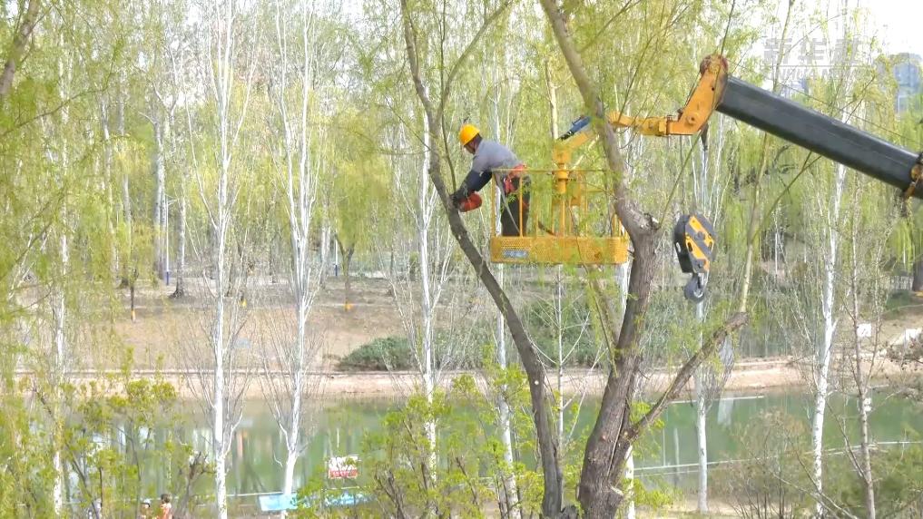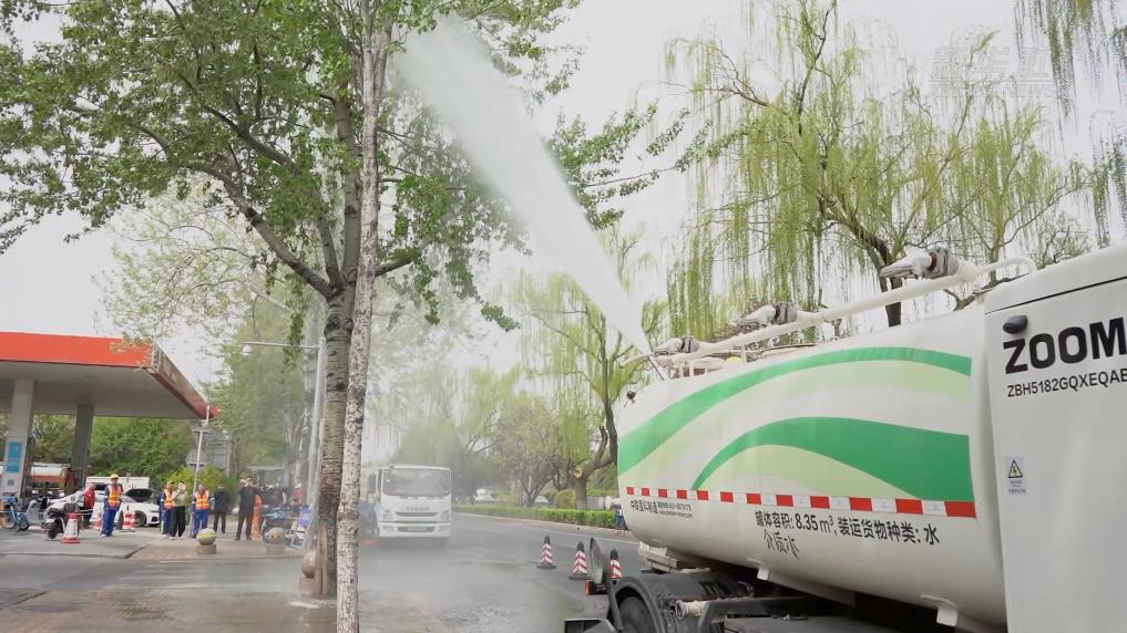 在北京市東城區東濱河路旁,記者看到,園林綠化人員正在修剪白毛楊的枝杈,同時用高壓水槍噴淋樹枝。