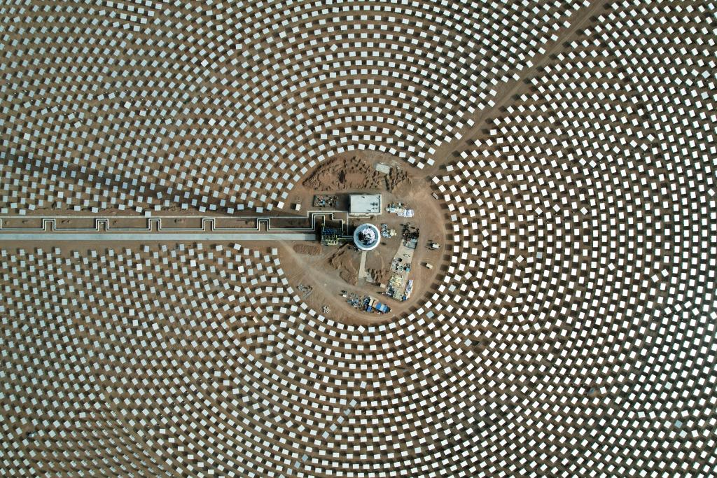 這是3月7日在敦煌光電產業園區拍攝的首航高科敦煌100兆瓦熔鹽塔式光熱電站(無人機照片)。新華社記者 張睿 攝