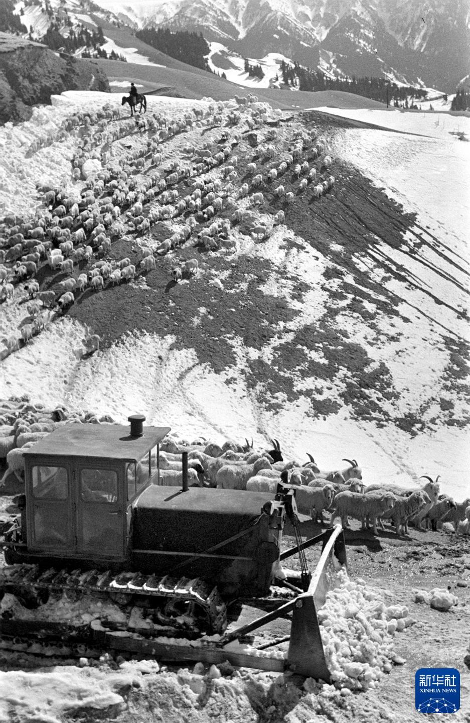 伊犁新二臺路段的養路工開來推土機為牧民清雪開路,使畜群安全順利地通過果子溝牧道。1973年4月17日發