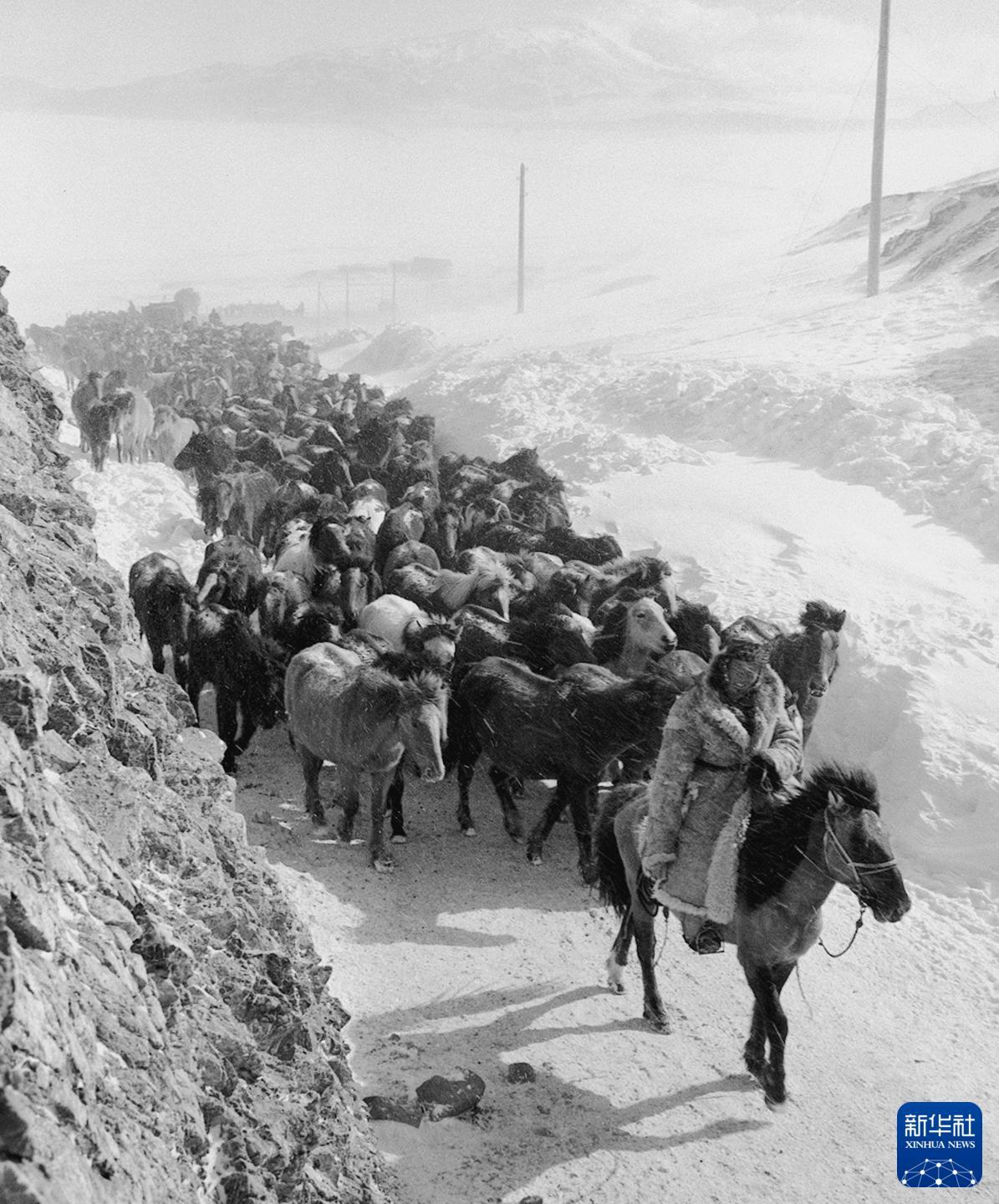 這是轉場的牧民們保護著馬群勝利通過艱難的道路。1964年4月13日發