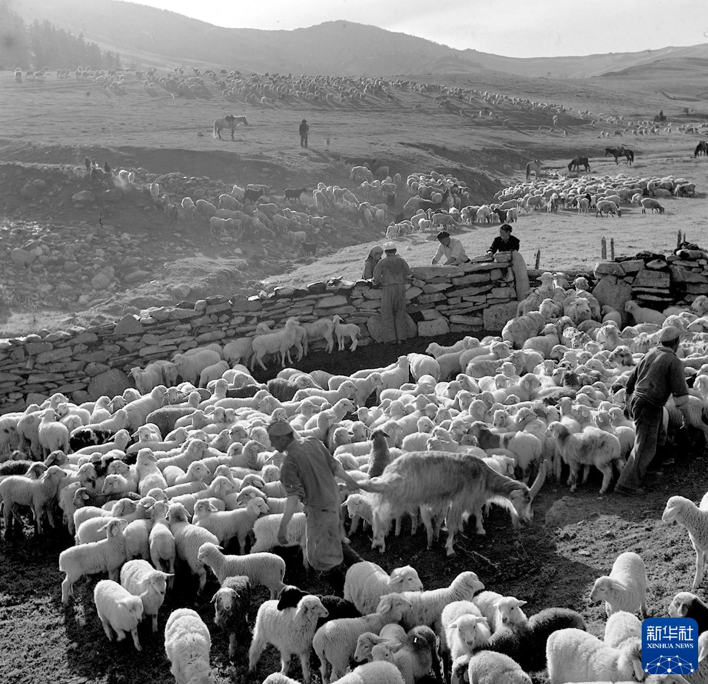 新疆阿勒泰草原上的克木齊人民公社放牧的新疆細毛羊。1965年9月10日發