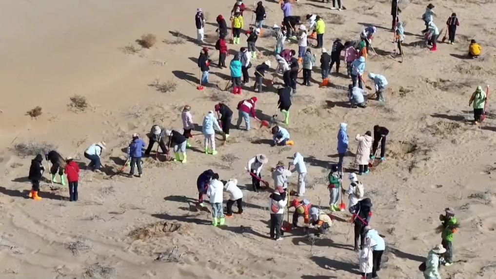 沙漠的春天與眾不同,在技術人員的指導下,來自全國各地的志愿者忙著種植梭梭、花棒等沙生植物。