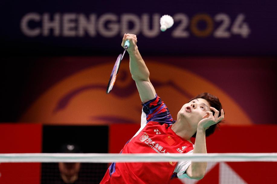 2024年5月5日,在四川成都舉行的2024年湯姆斯杯羽毛球團體賽決賽中,中國隊選手石宇奇在男子單打比賽中回球。新華社記者 沈伯韓 攝