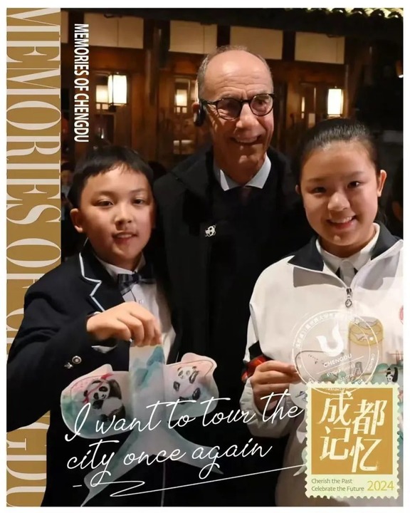 國際大體聯主席艾德收到的成都記憶定制文創風箏。圖為他與成都中小學生的合影。新華社發