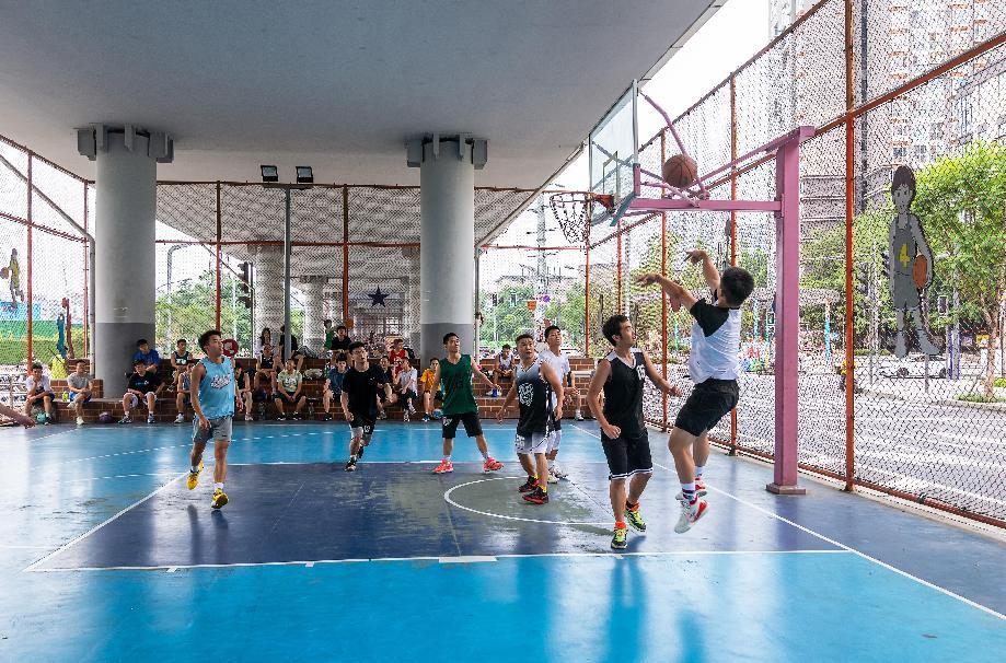 人們在成都市府青路立交橋下的運動空間打籃球。(資料圖)新華社發 杜寧 攝