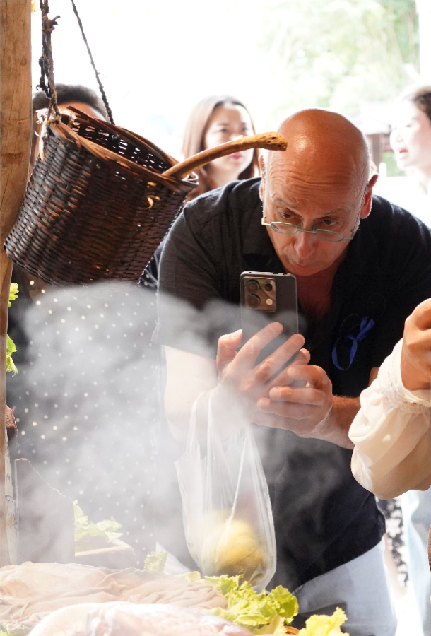 外國游客在四川旅游途中拍攝美食(2024年6月7日攝)。新華社記者 張超群 攝