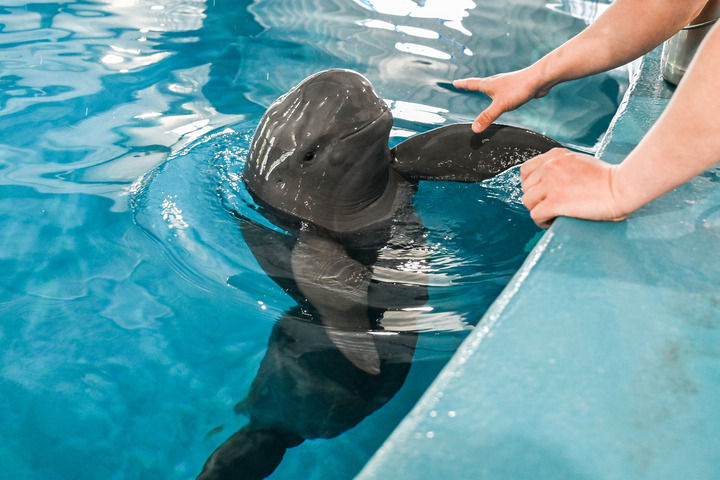 在位于湖北省武漢市的中國科學院水生生物研究所長江江豚繁育研究中心,訓練員給長江江豚喂食(2025年4月17日攝)。新華社記者 杜子璇 攝