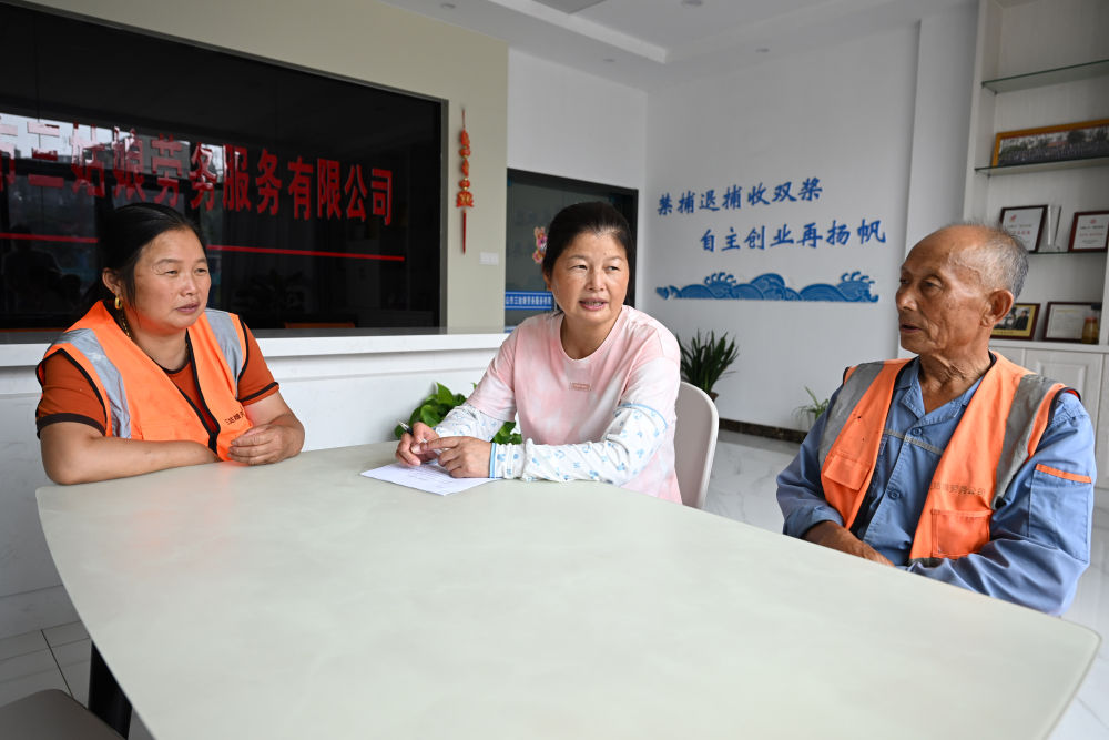 在安徽馬鞍山市三姑娘勞務服務有限公司,陳蘭香(中)和工作人員交流(2023年7月24日攝)。陳蘭香是安徽省馬鞍山市薛家洼的上岸漁民,在當地政府的幫助下,她和其他漁民合伙開辦了勞務服務公司,主營保潔、綠化養護等服務。新華社記者 周牧 攝