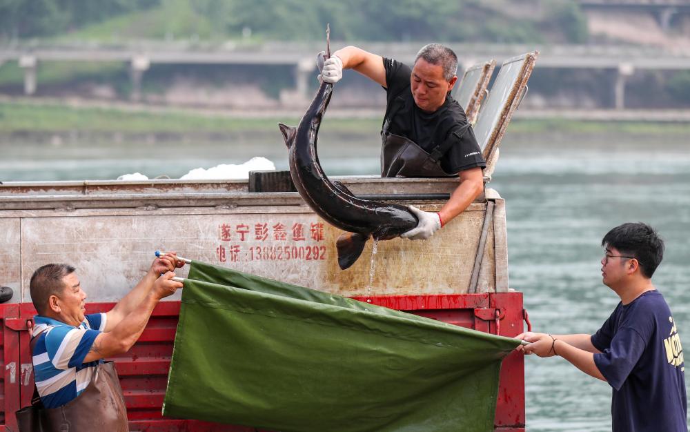 在四川省宜賓市三江口長江公園,工作人員將放流的長江鱘搬運到增殖放流池(2024年6月6日攝)。新華社發(莊歌爾 攝)