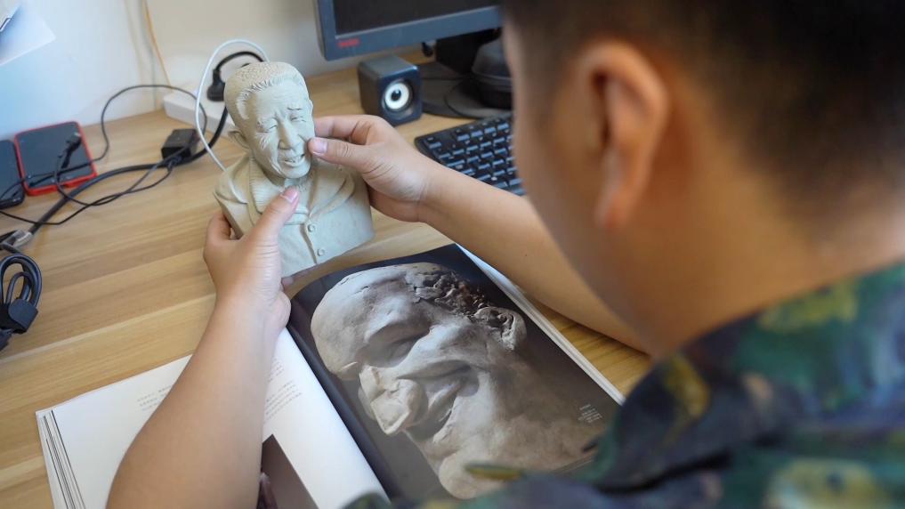 在河北省曲陽縣未來創業孵化基地的一間工作室內,22歲的劉旭碩和其他工作伙伴正忙著制作泥塑,隨著雕刻刀上下翻飛,一位老人的面容逐漸清晰——這是一位網友定制的外婆紀念像。