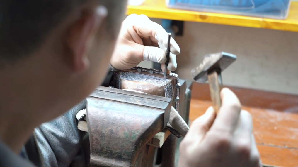 金永才自幼喜愛民間傳統藝術,18歲開始學習并致力于金、銀、銅飾品制作,29歲正式拜烏銅走銀制作技藝第五代傳承人李加汝為師,系統學習這門傳統技藝。