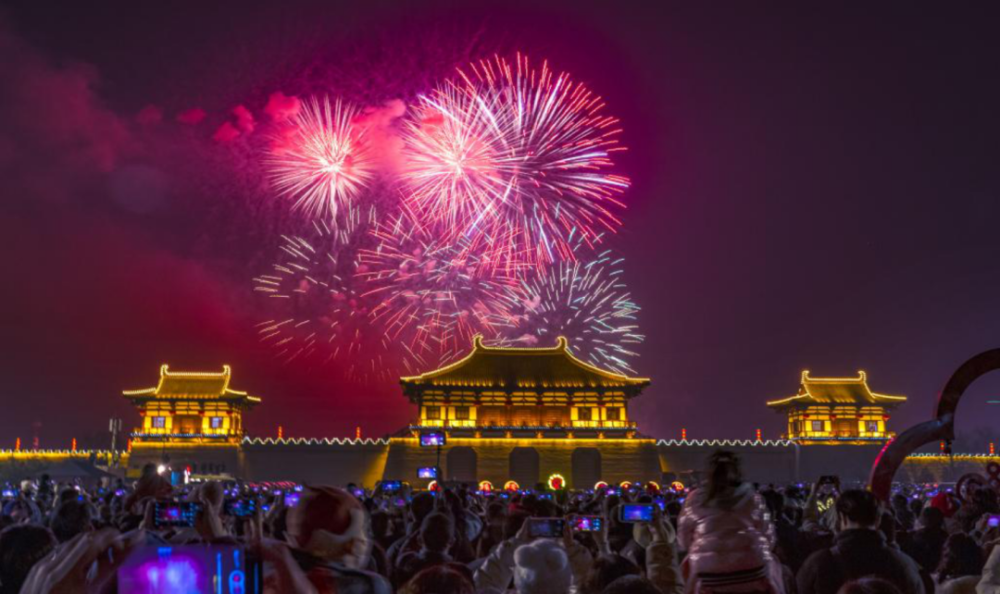 市民在洛陽市洛龍區定鼎門廣場觀賞焰火晚會。新華社發(張怡熙 攝)