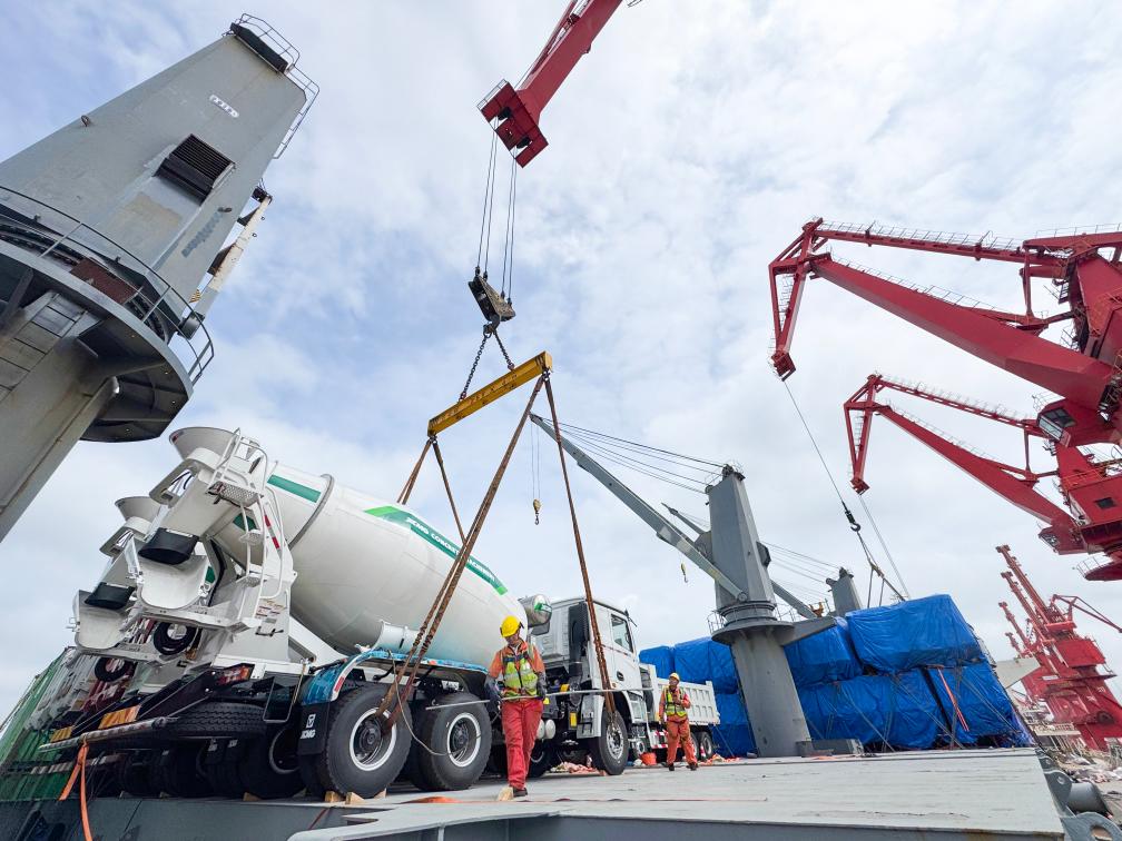 在日照港石臼港區件雜貨作業現場,作業人員正在進行工程車輛甲板捆扎作業。新華社記者張鐘仁 攝
