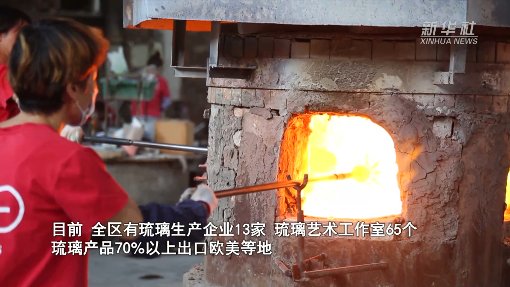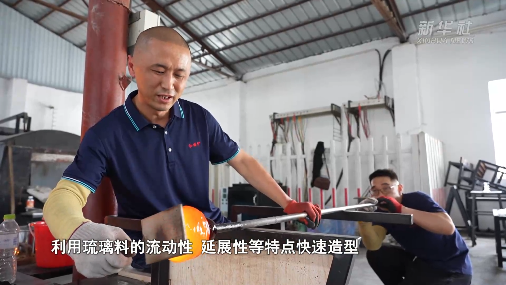 初夏時節,山東博山琉璃老字號“和順爐”的生產車間已是酷熱難耐。孫云浩和工匠們用中空鐵管從1400多攝氏度的窯爐里取出熔化的琉璃料,吹、塑、展、粘、捻、拉,利用琉璃料的流動性、延展性等特點快速造型。