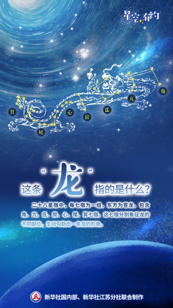 中國科學院紫金山天文臺科普主管王科超介紹,端午節當晚可見的“龍”是東方蒼龍,包含角、亢、氐、房、心、尾、箕七宿?!斑@七宿分別象征龍的不同部位,角宿作龍頭,亢宿為脖頸,氐宿為胸膛,房宿為龍腹,心宿是龍身,尾宿和箕宿共同代表龍尾,生動勾勒出一條龍的形象?!蓖蹩瞥f。